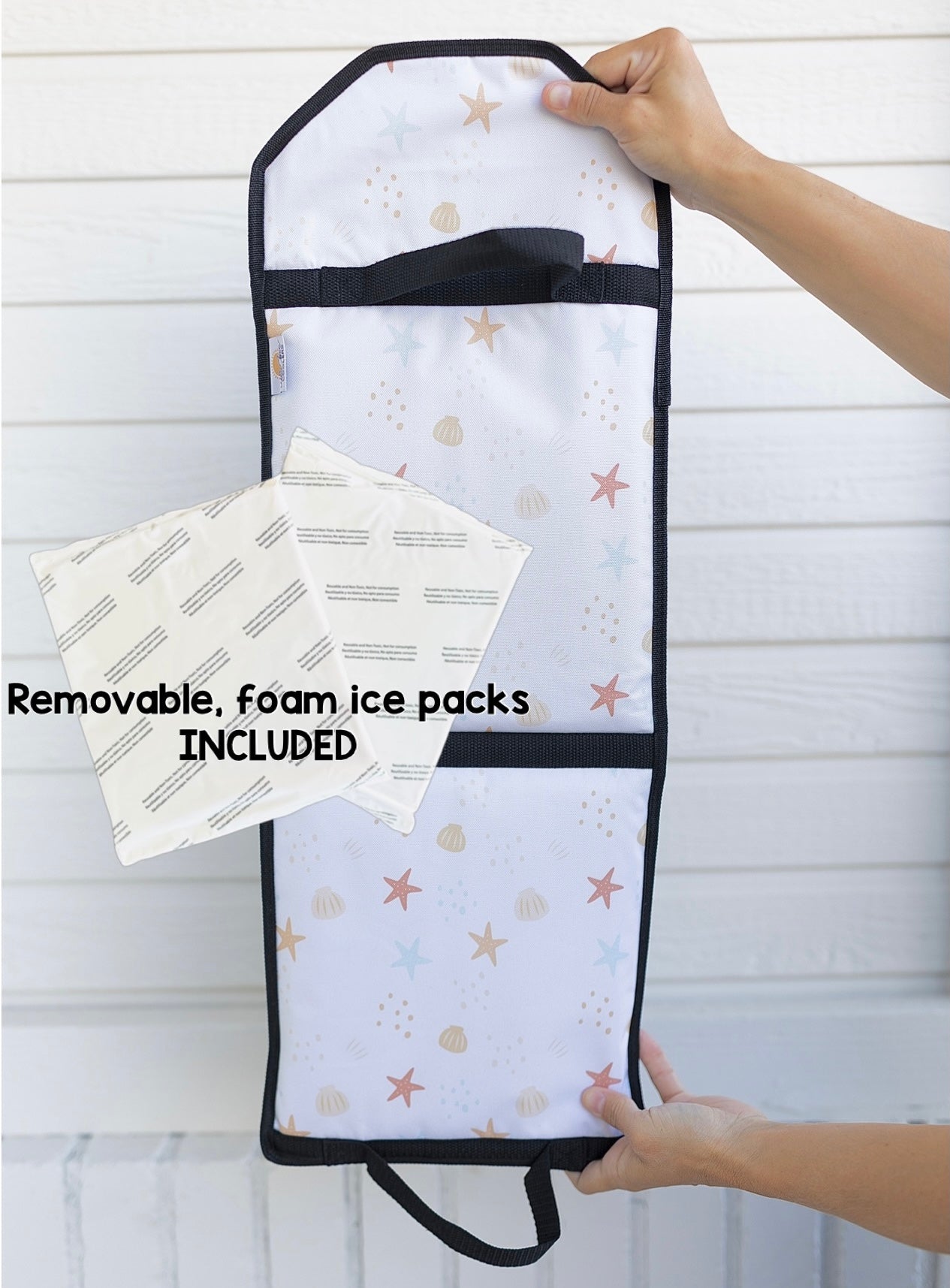 - Holds 2 custom-size, foam ice packs (included).