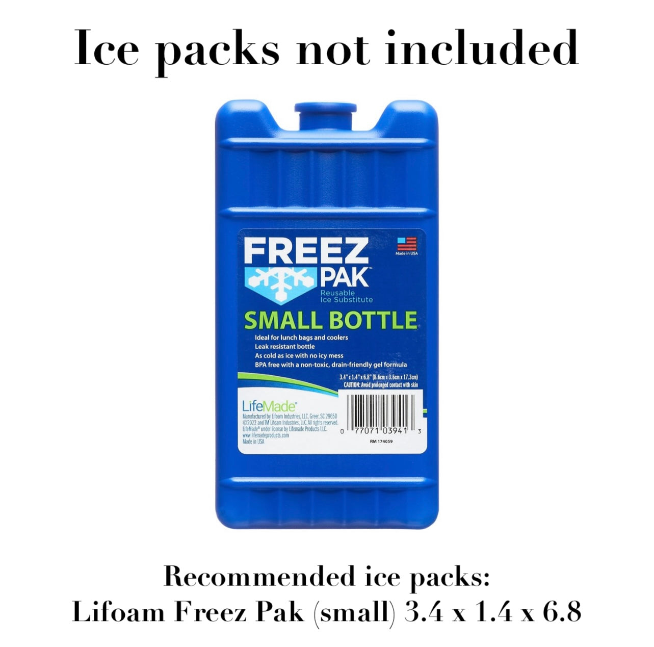 - Recommended ice packs: Lifoam Freez Pak Small: 3.4" x 1.4" x 6.8"